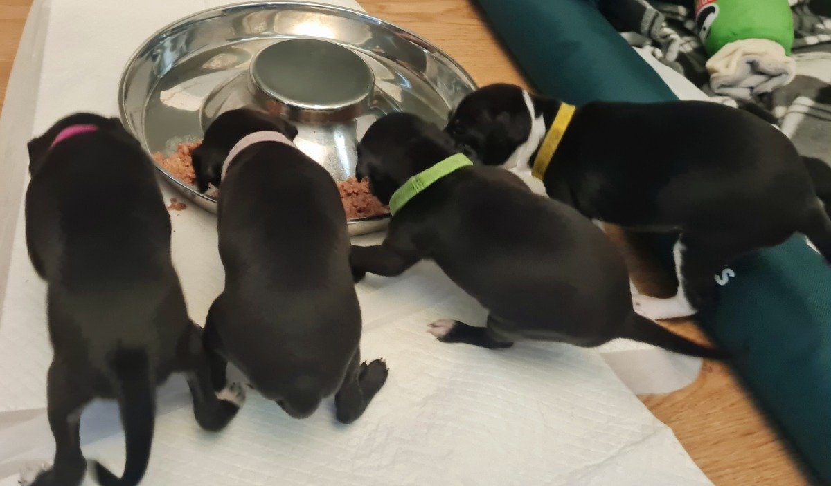 Black with a touch of white, puppies are £2000. All puppies will be vaccinated and microchipped before going