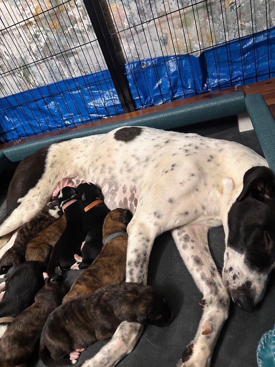 My family pet has had 8 puppies 4 girls and 4 boys – Mum is a Lurcher and dad is German shepherd, these dogs will be on the larger side as both mum and dad stand tall.
