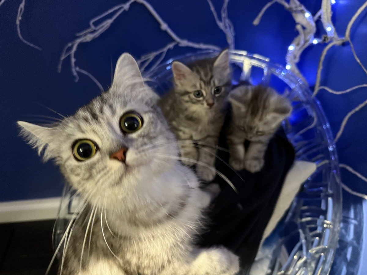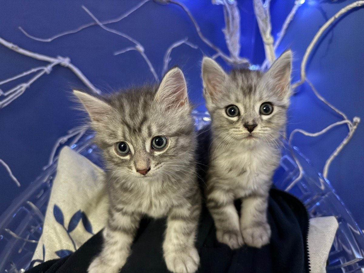 These little fluffy babies were born on 14th August 2025 at 7:30am to mummy, ‘Theia’ (Tabby / Persian Cross) and daddy, Shiloh (Maine Coone / British blue cross).