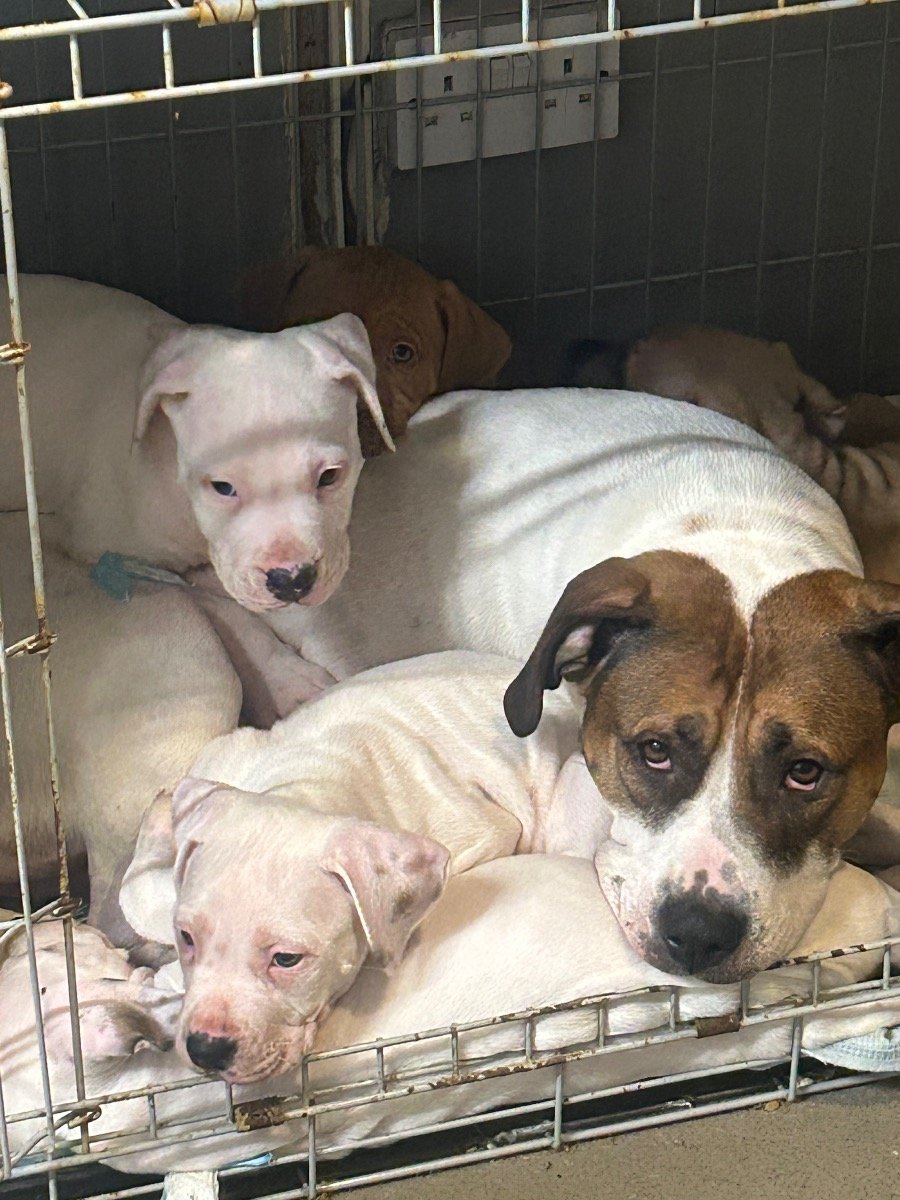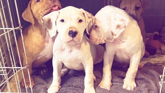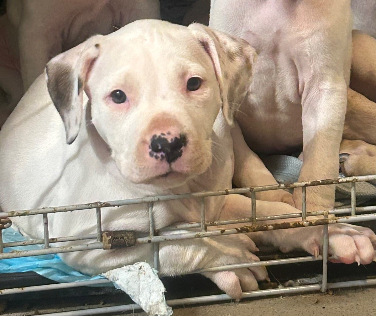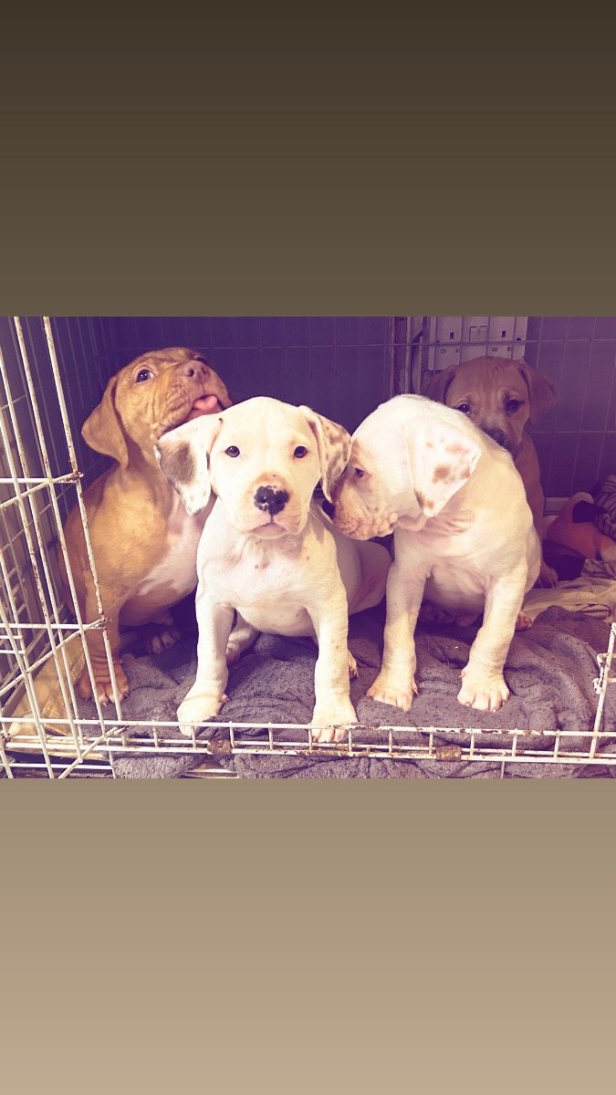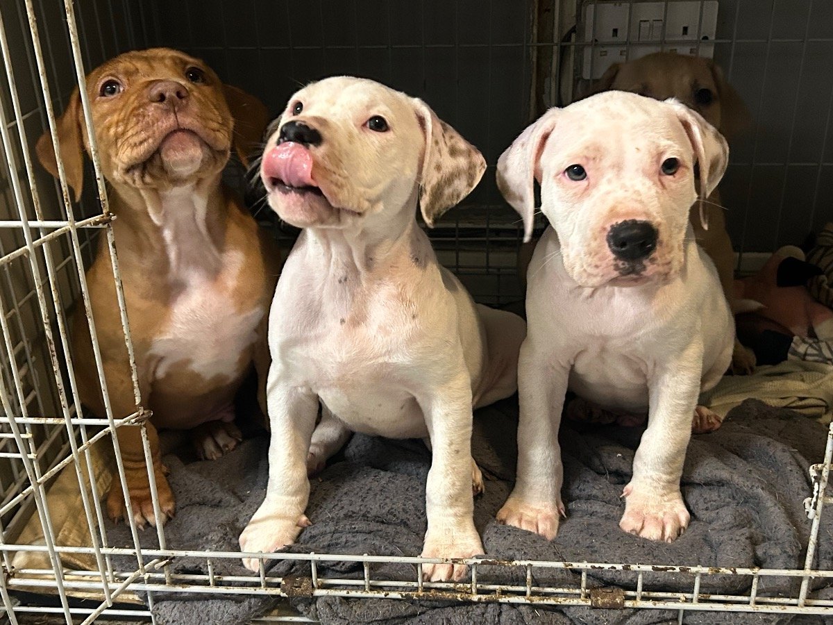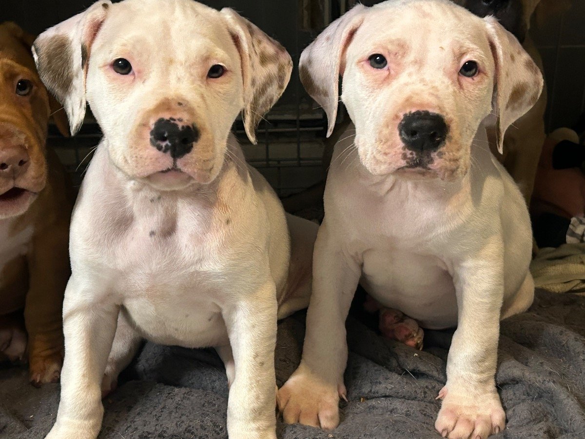 2 beautiful white pups with brown spots on ears these two love cuddles lots of attention they have been chipped and are ready to find their forever homes.