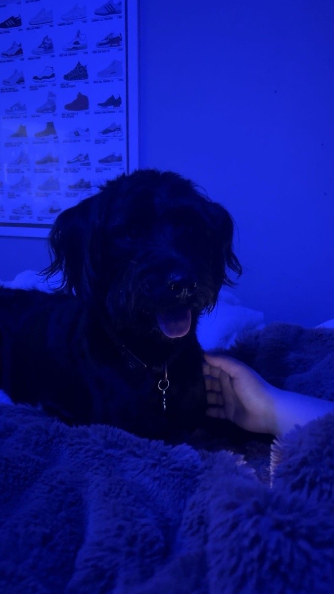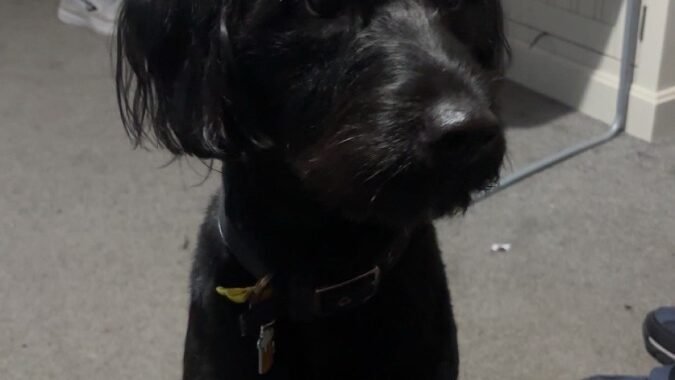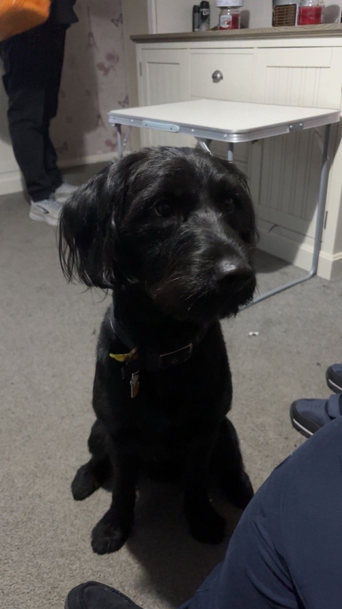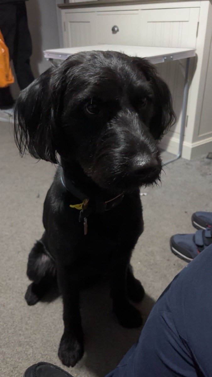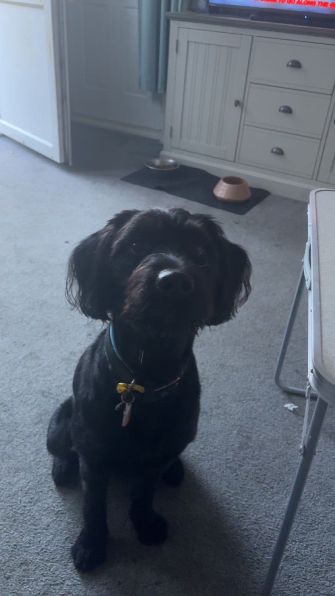 His name is Cosmo, he’s a beautiful black labradoodle with a furry white belly. Due to health issues we’ve found it difficult to take care of Cosmo, and believe he needs a better home than the one we can give him. He is toilet trained, he’s energetic and just lovely.