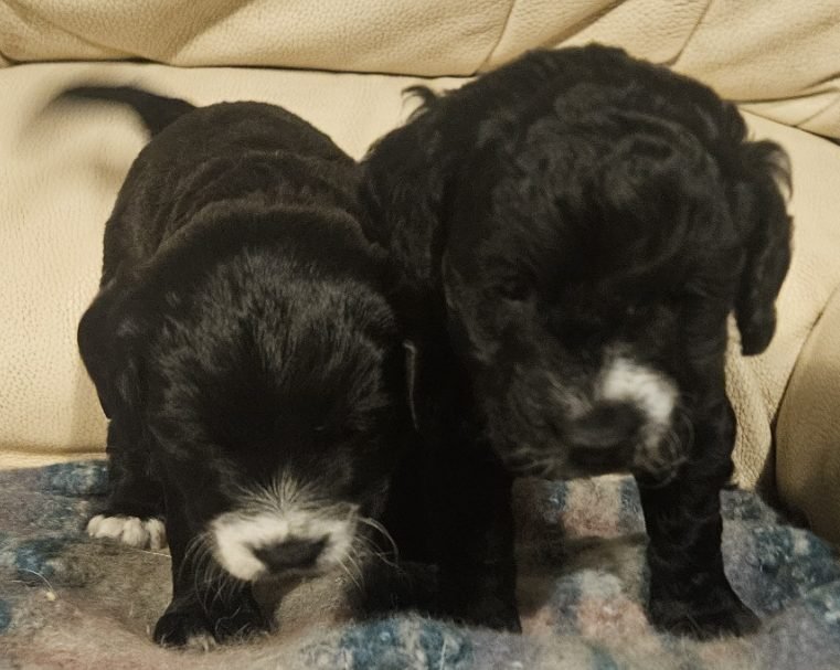 2 Black Cockerdor puppies with white stripe on chest and nose (1 full white nose with left back paw in white, 1 half white nose with both back paws having white tips), will grow to the size of a spaniel with a high gloss curl to the coat (both female).
