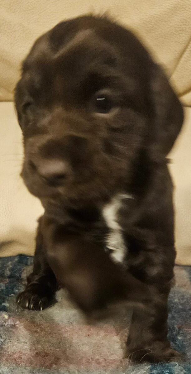 1 Chocolate Cockerdor puppywith white stripe on the chest and short straight coat, will grow to ¾ the size of a full Labrador and will share the Labrador high gloss coat (female).