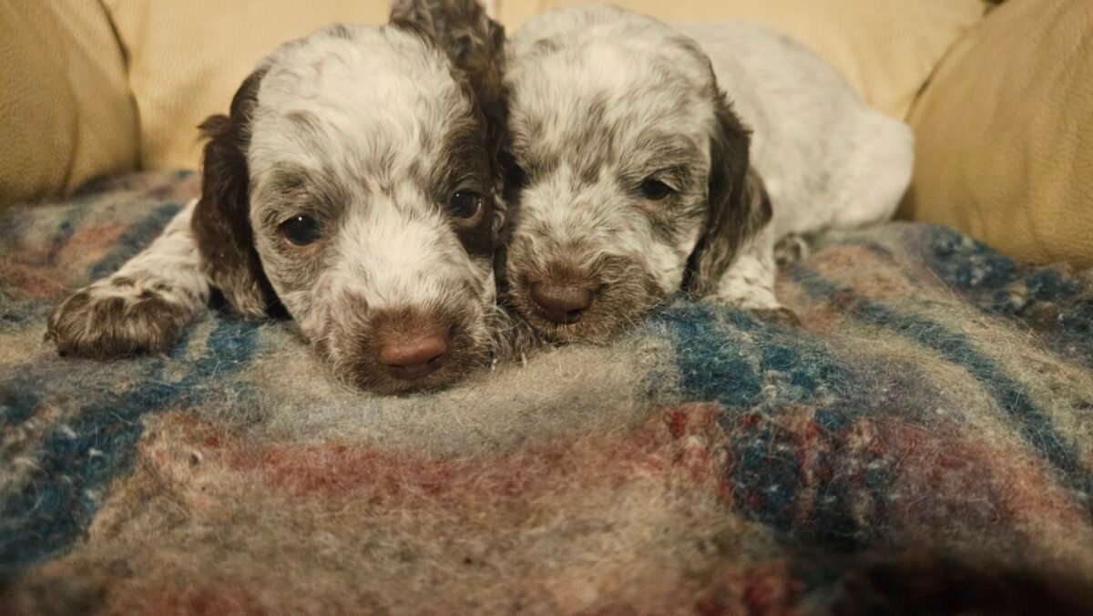 2 White and Brown spotted Roan Cockadors, which will grow to the size of a spaniel with nice curl to the coat (both male).