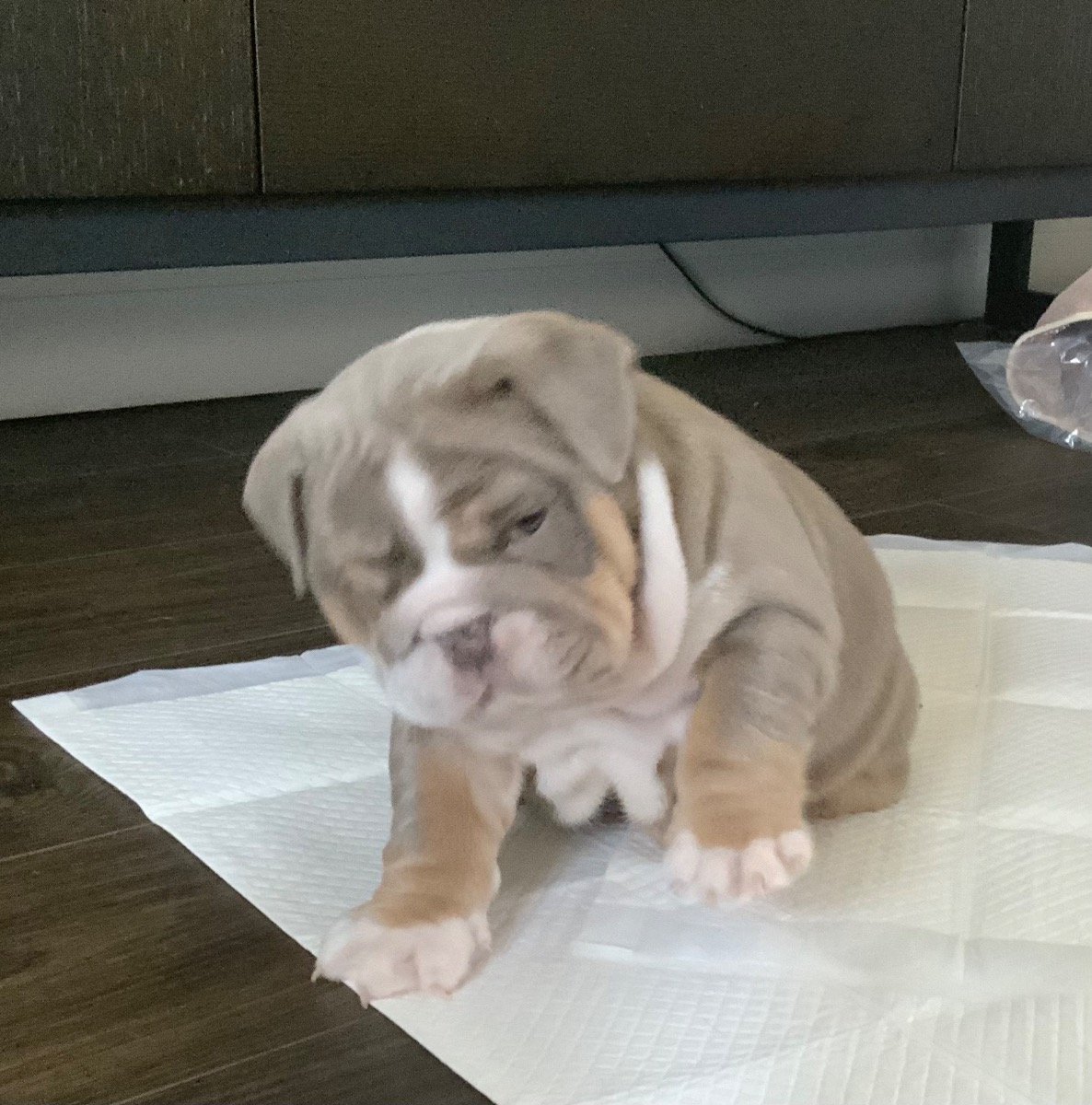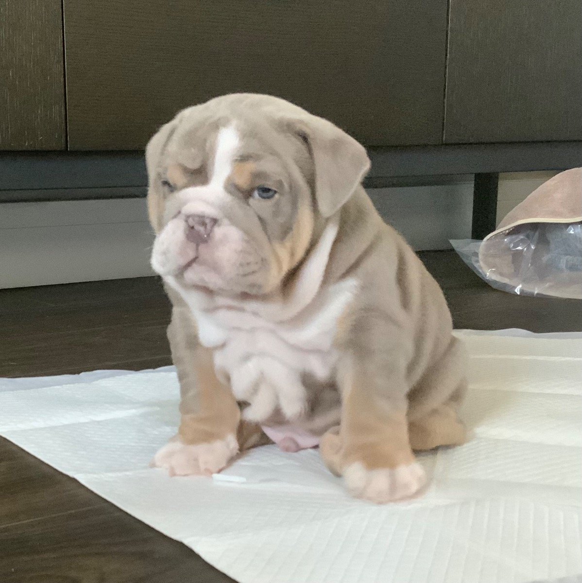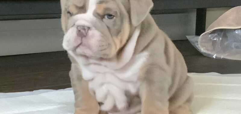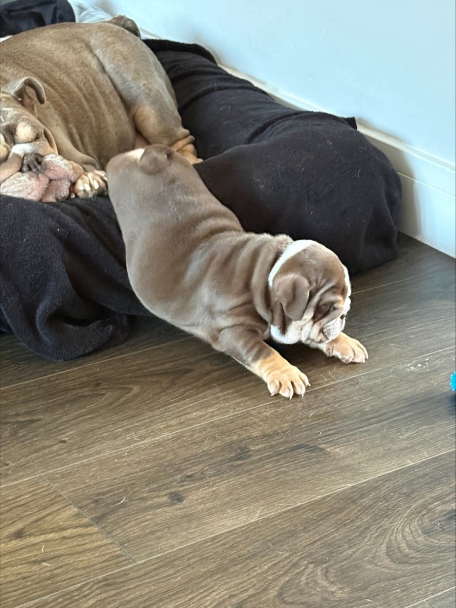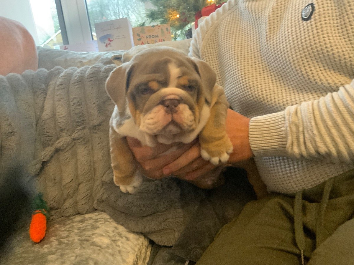 Meet this sweet, happy lilac tri English Bulldog boy! He’s KC registered, vaccinated, dewormed, and microchipped — totally ready to join his new family starting tomorrow!