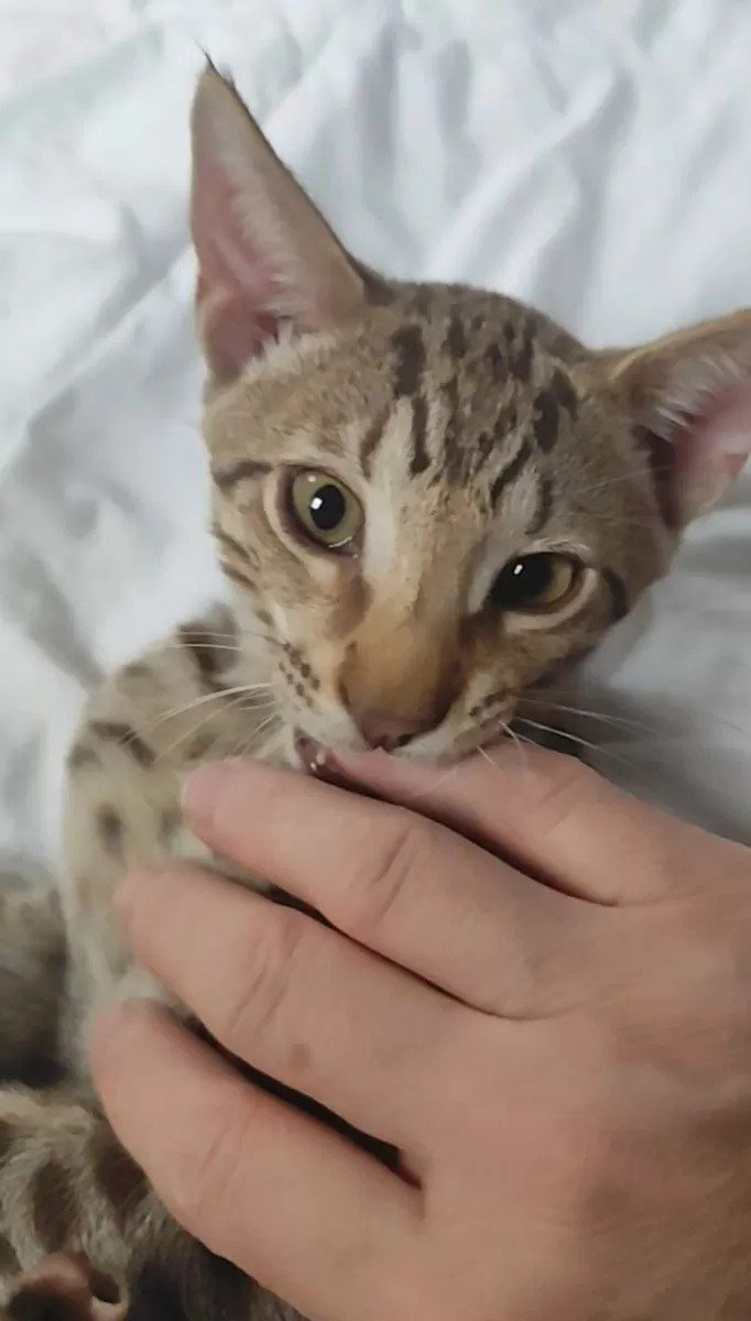 This kitten combines the athleticism and wild beauty of a Savannah with the more manageable temperament of a later generation. His Chocolate Spotted Mink Tabby pattern is highly prized among enthusiasts.