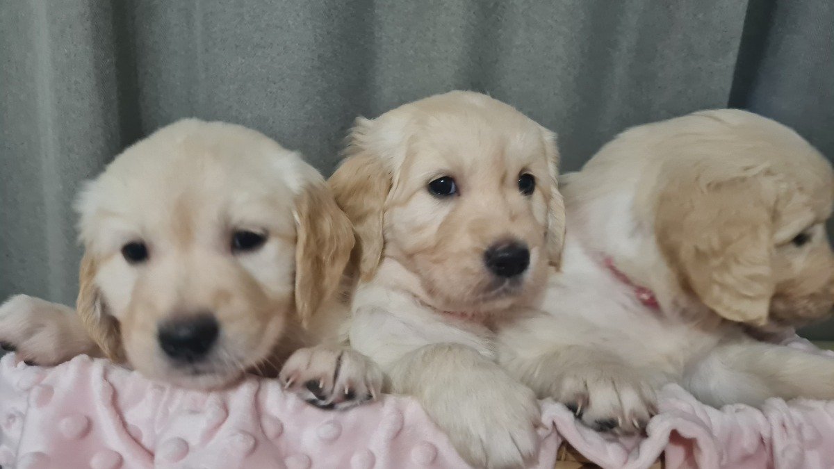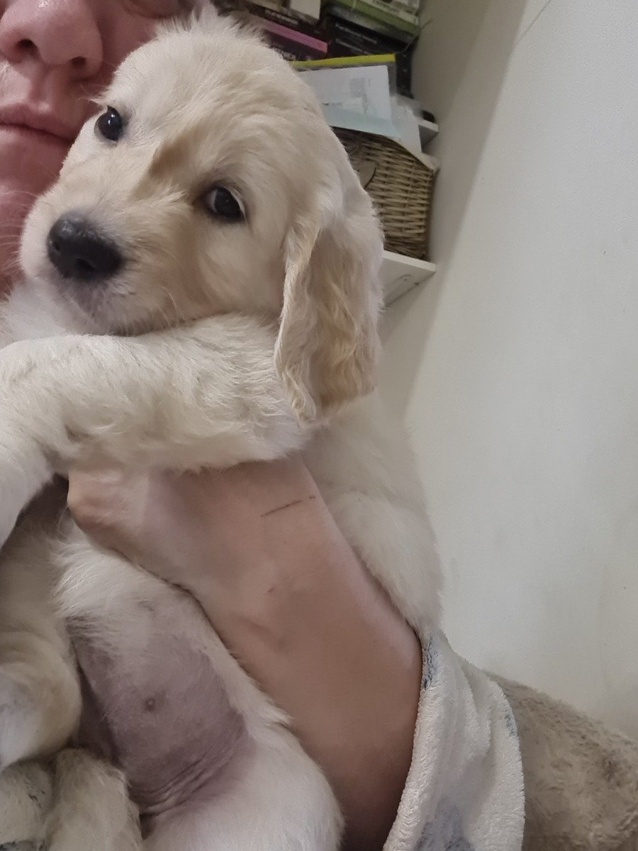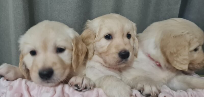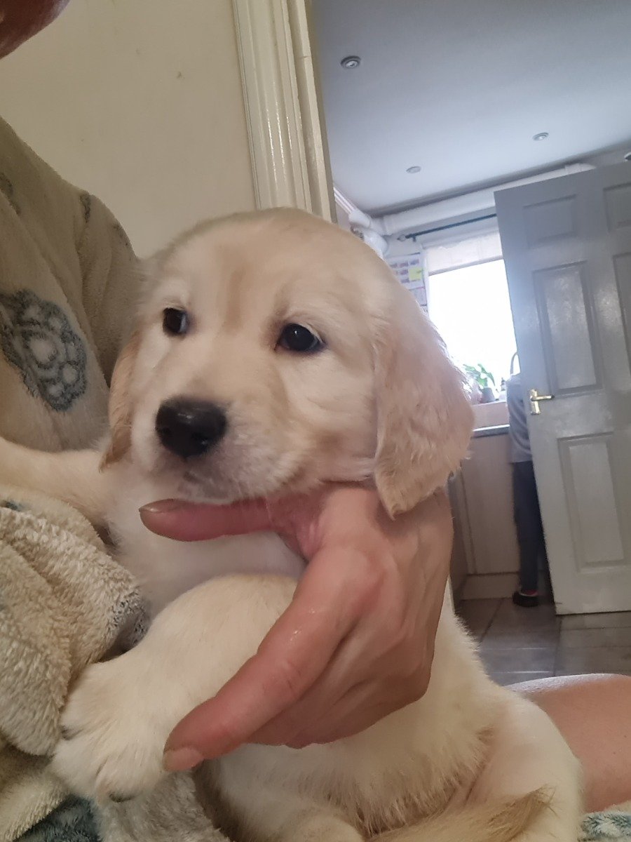 Golden Retriever puppies looking for their forever home. They will be ready to leave me on 20 February. If you would like to reserve one £200 deposit is required. Once deposit is take you will receive weekly updates of photos and videos. We are raising the puppies at home with the love.They will come with: