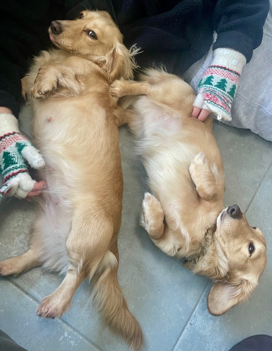 Long haired miniature dachshunds . English cream one little boy and a little girl.