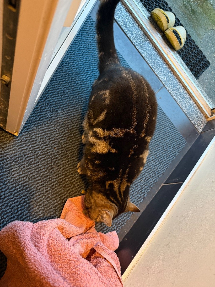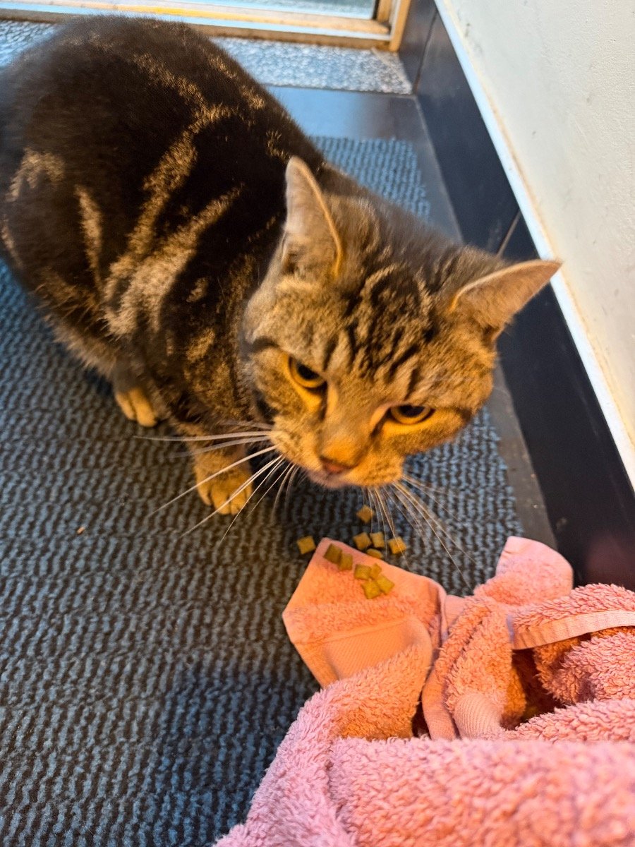 He is very shy, but he loves playing with a laser. I have a plastic litter box with flaps, cat tree 2 levels, treats and food. He prefers wet food instead of dry one. He loves little pate treats.