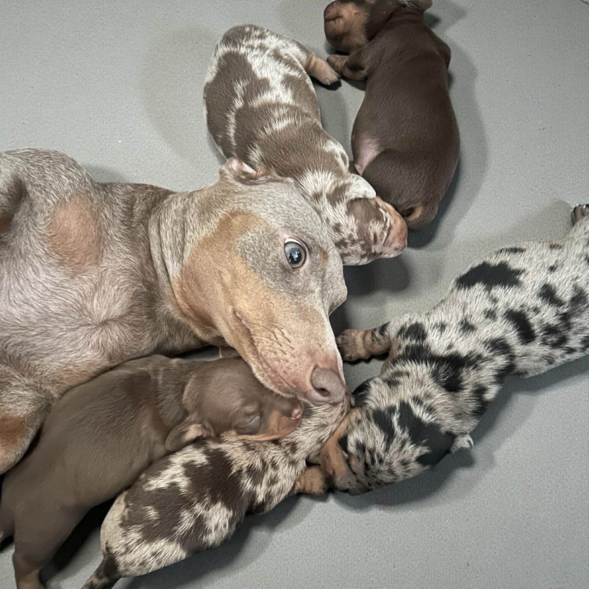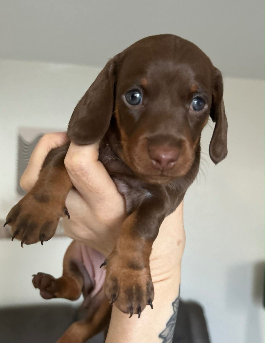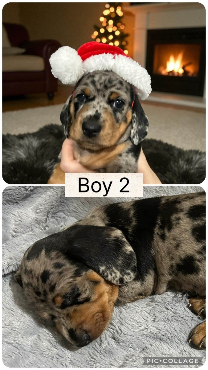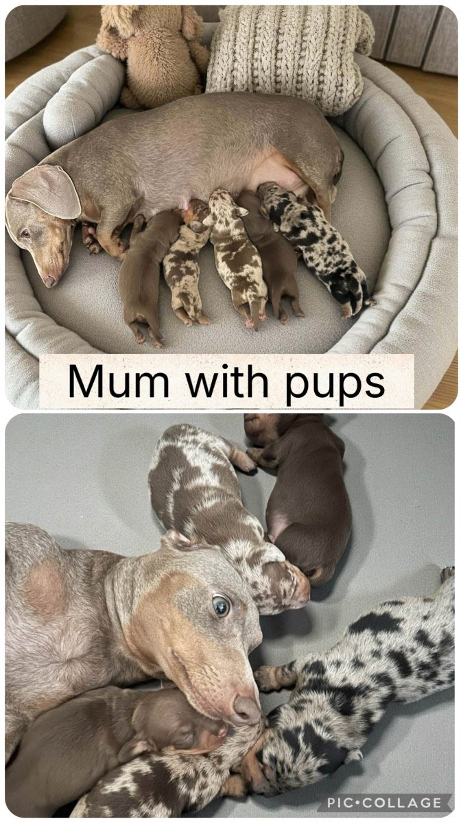 My beautiful Issabelle has had a litter of 4 stunning miniature Dashound 2 boys and 2 girls they are kc registered.She has been extremely amazing mummy to them and still going strong they are just over 5 wks old and are very chunky pups .mom and dad have amazing temperaments and pups are being well socialised with other dogs and young children they are familiar of household noises and getting used to solid foods .They have all been vet checked ,microchipped and wormed and flead to date .i only want them going to loving homes were there needs are met as I absolutely adore my fur babies .A deposit of £250 will reserve the pups but will be non refundable .Please only contact if your sure and can offer loving homes as they deserve so much they will be ready to leave mom in the 12th of December.