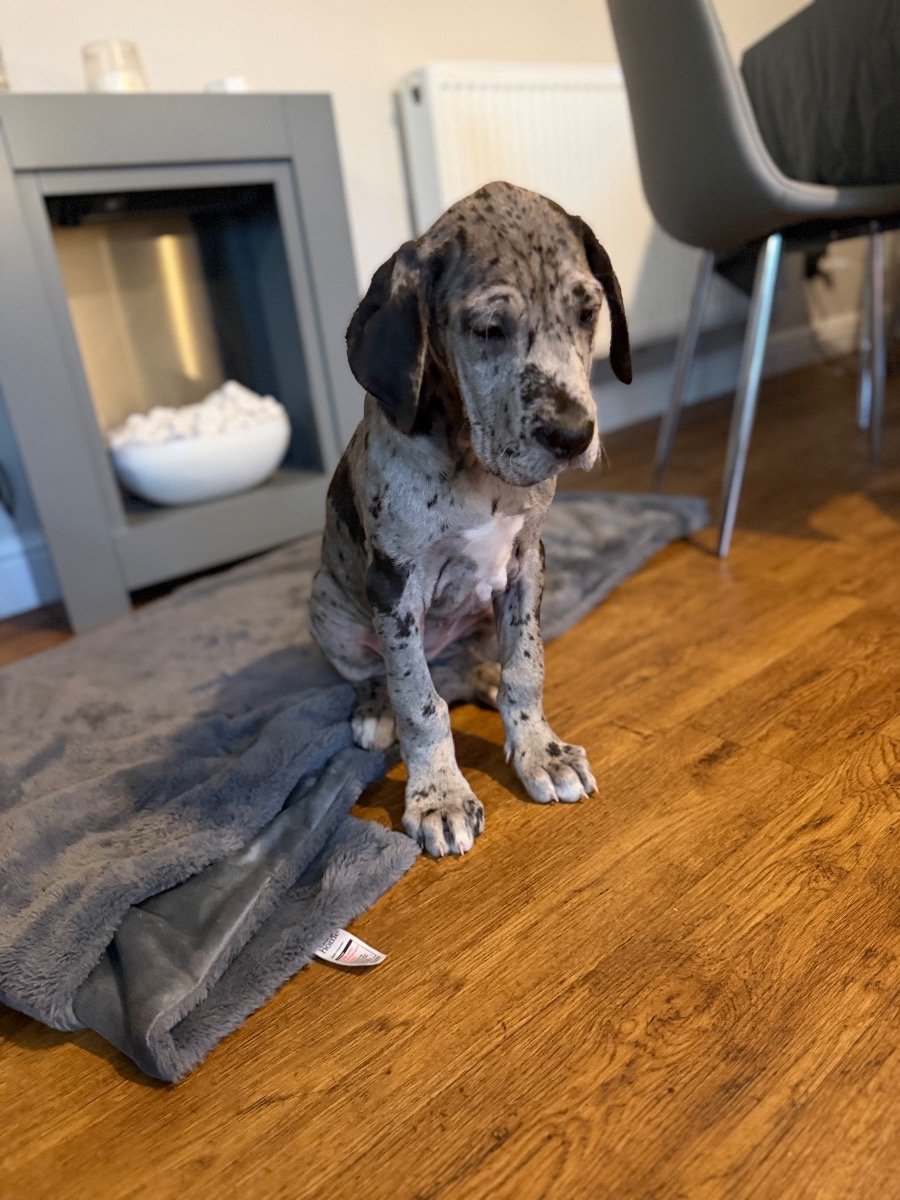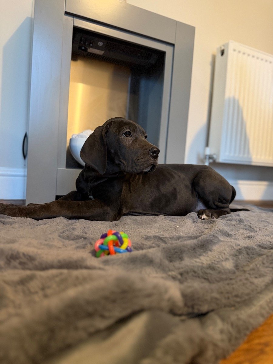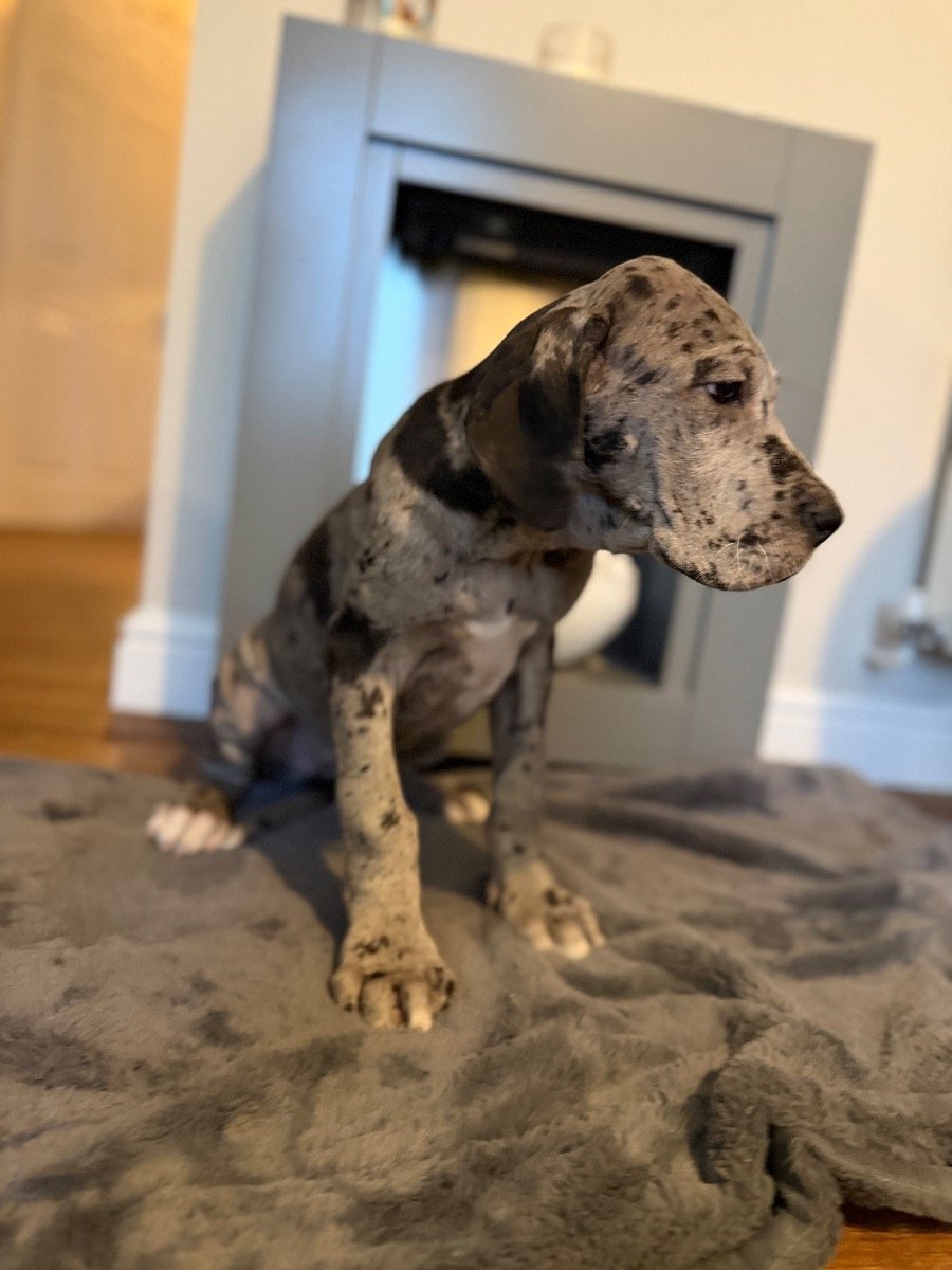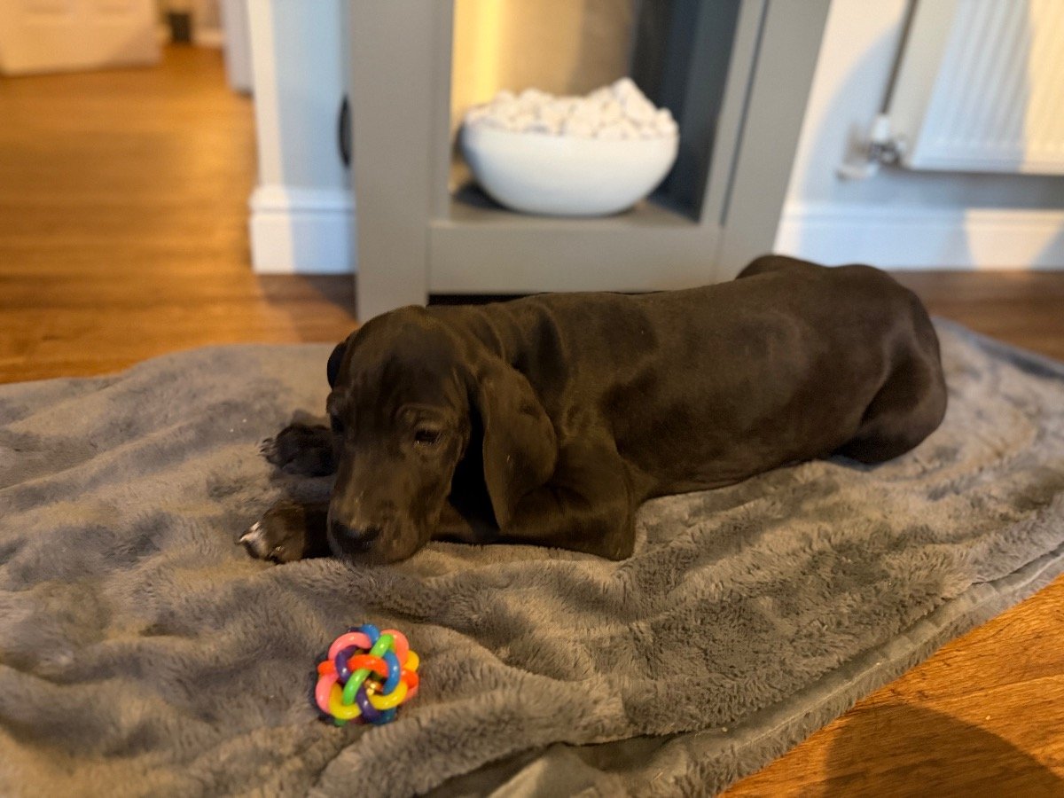 Our beautiful Great Dane Bambi gave birth to 14 healthy pups, we were extremely lucky to have a beautiful litter of harlequins and solid blacks. Bambi is our beautiful family pet that’s available to be seen with pups on viewings.