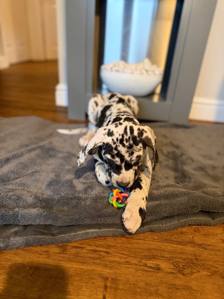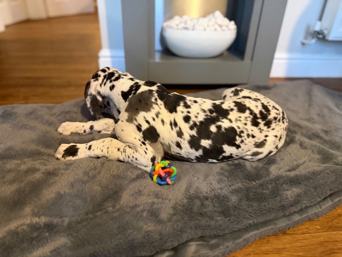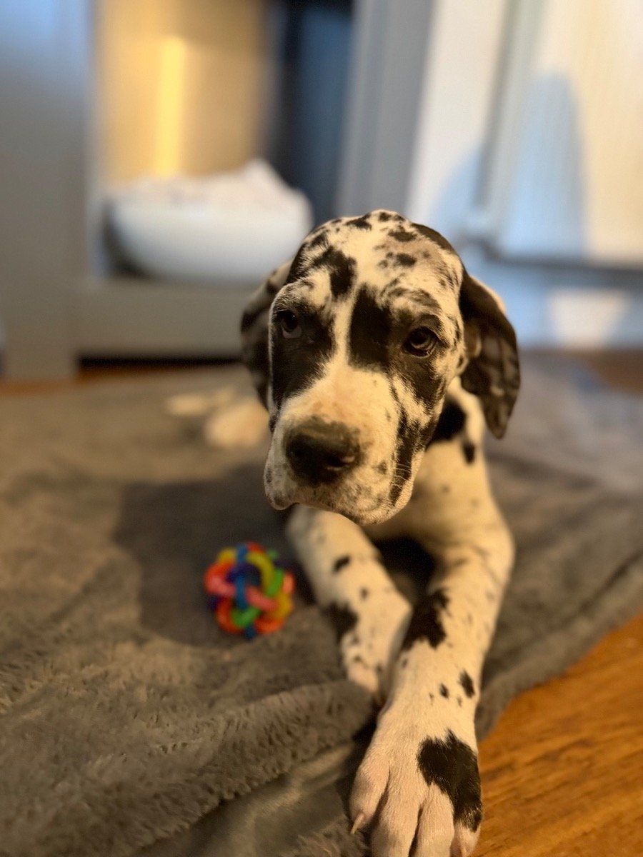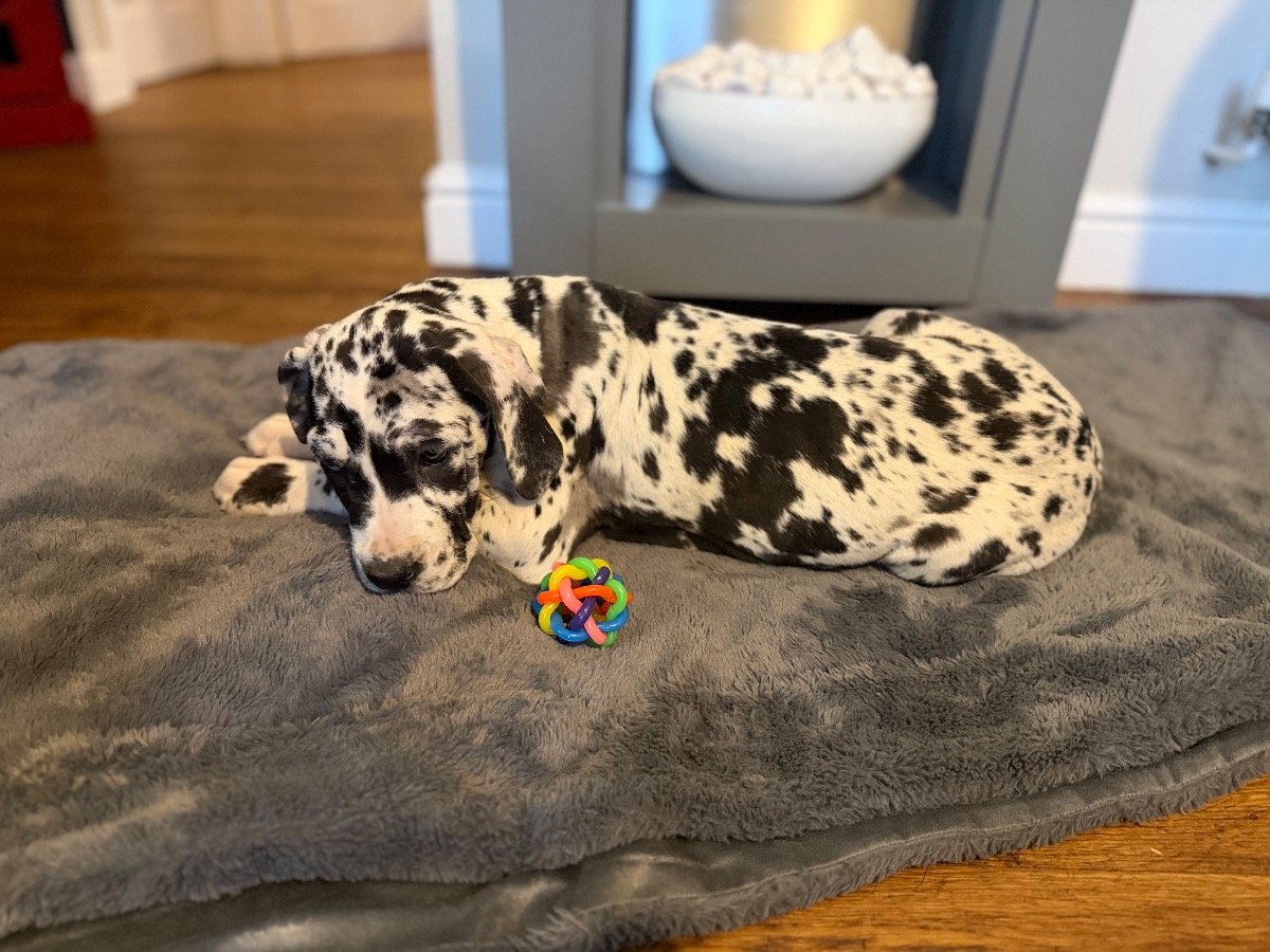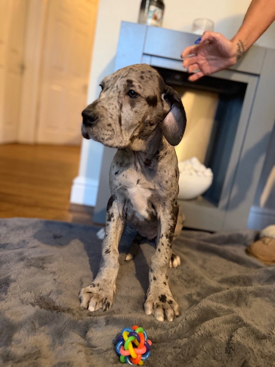 Our beautiful Great Dane Bambi gave birth to 14 healthy pups, we were extremely lucky to have a beautiful litter of harlequins and solid blacks. Bambi is our beautiful family pet that’s available to be seen with pups on viewings.