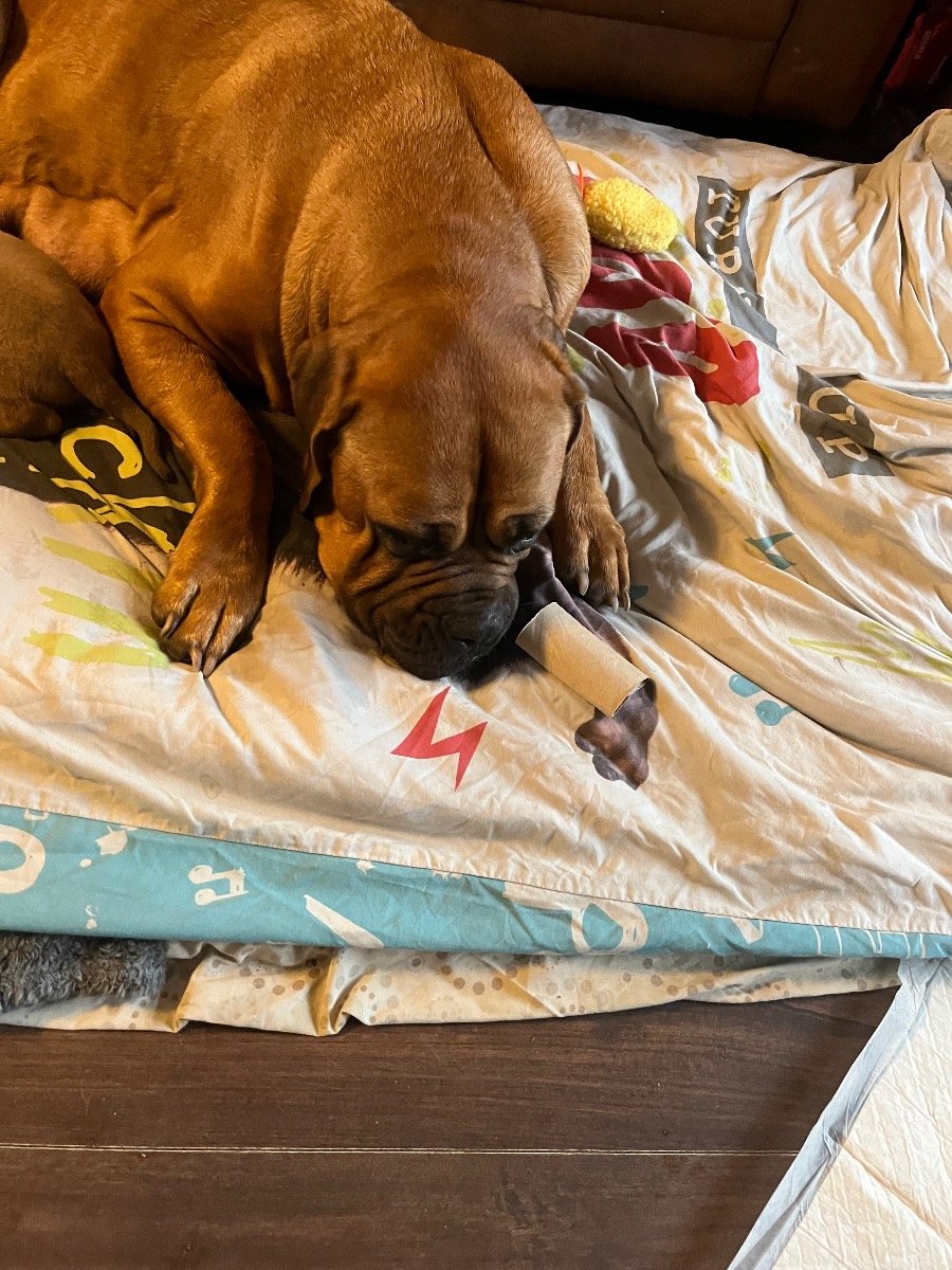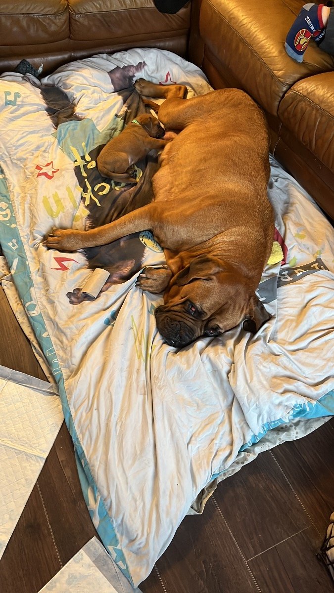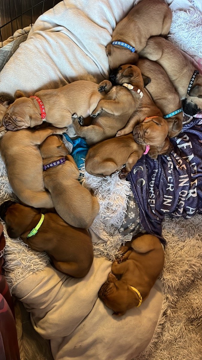 Our beautiful family dogue de Bordeaux, had a litter of 12 beautiful puppies. We only have 5 left