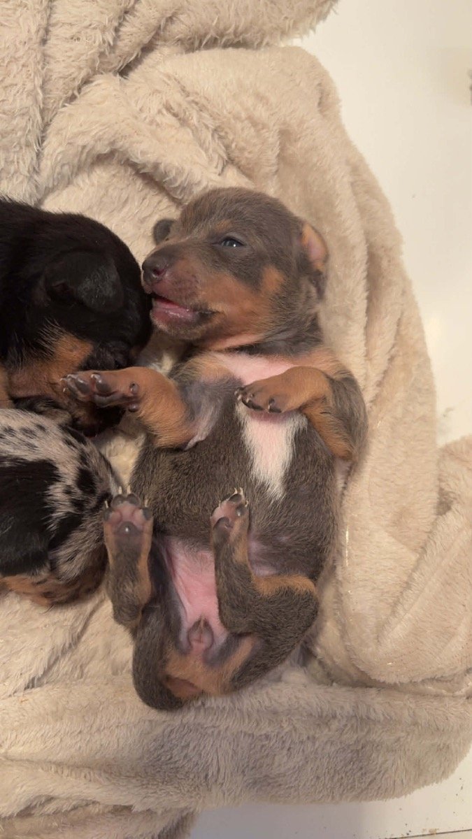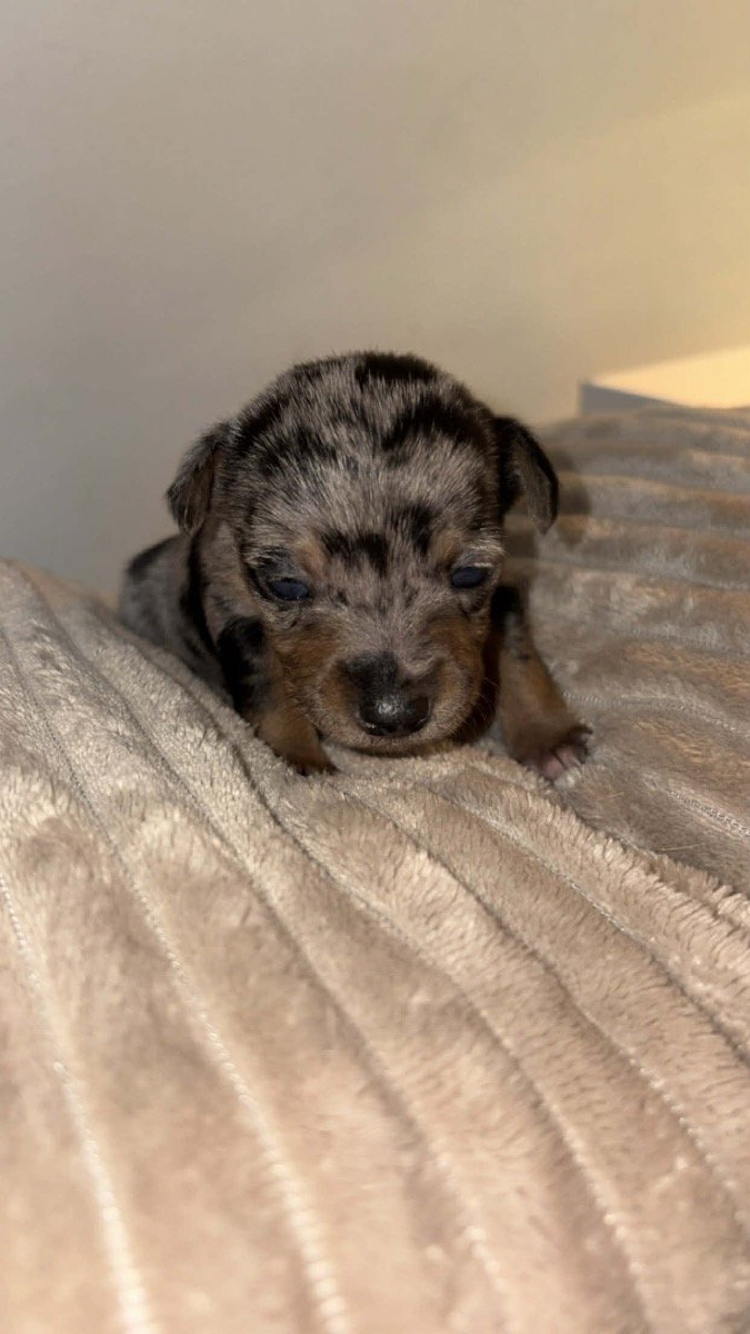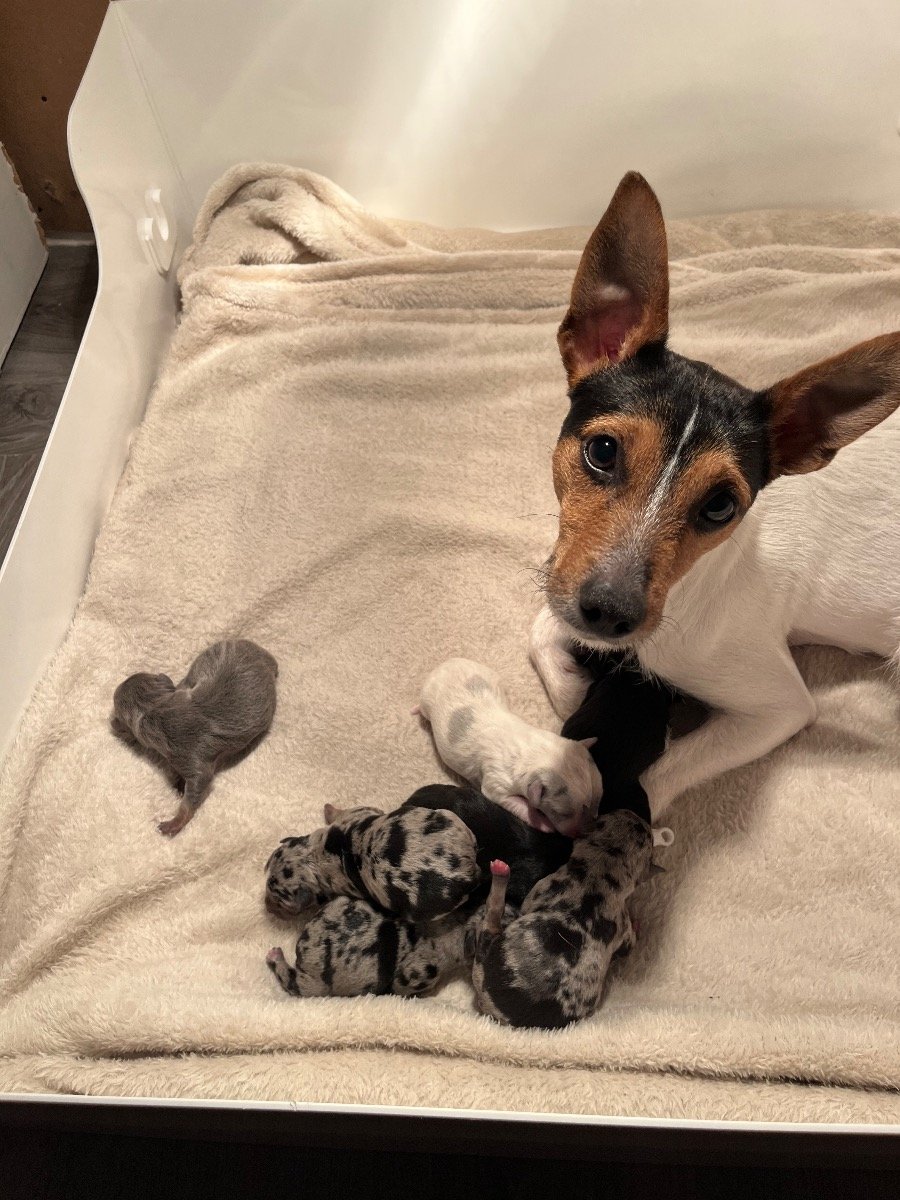 3 blue, white merls/1 lilic/ 2 black tanned JR puppies all brought up in a family loving home with 3 other JR dogs I have grandma lady, Oreo the mother and daughter tiny. That you can happily meet on your arrival. Also Can be shown grandad and father is in the photos with proof or breed too!!