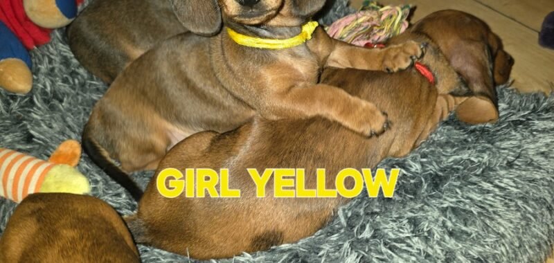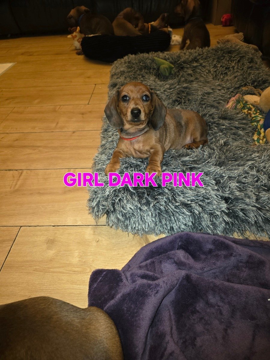 Ready now to go to their forever homes.5 adorable miniature dachshunds-4 females and 1 male left 9 weeks old. Among them, 3 girls and the boy they are shaded red,and 1 girl is red dapple. All puppies have sweet personalities and are very playful, just like their mother. Thev have been socialized with other pets and young children and enjoy being held and cuddled. They are KC registered, microchipped, and have had their first vaccination and been vet checked. They will also be up to date with flea and worm treatments. Each puppy will come with a small bag of food, a toy and a blanket.