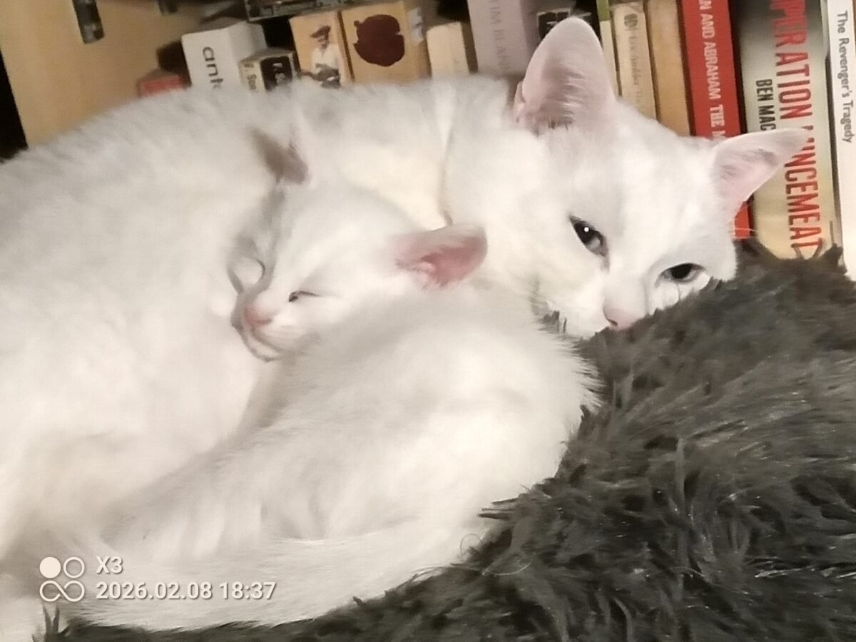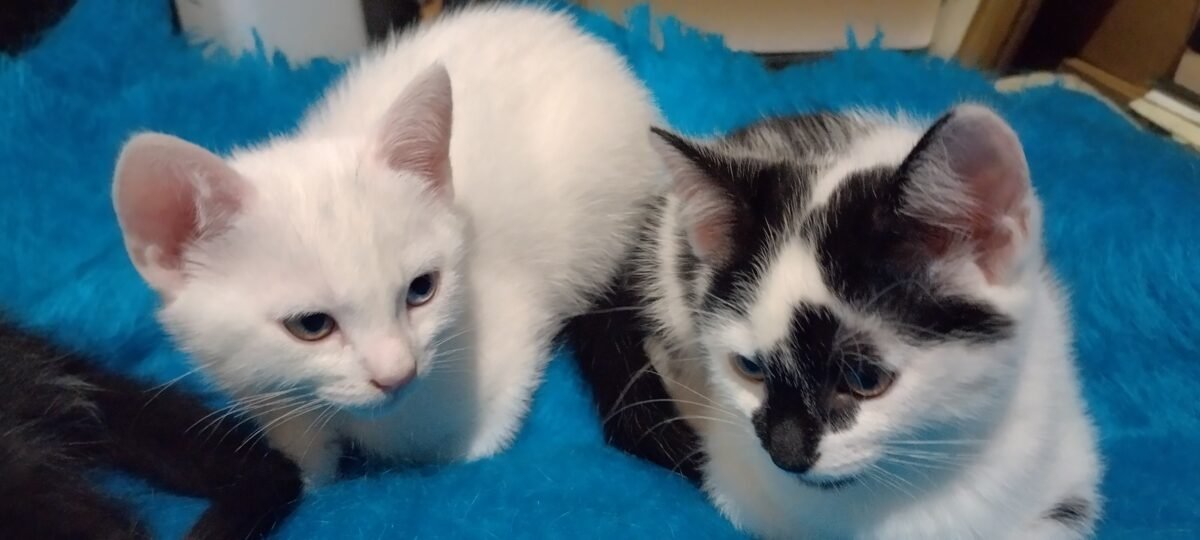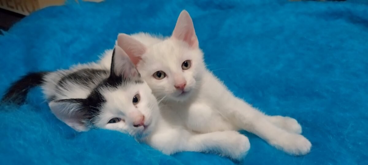Two white male kittens – one with different coloured eyes – blue and amber,