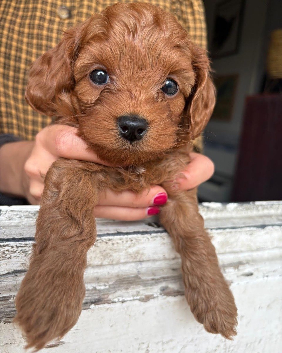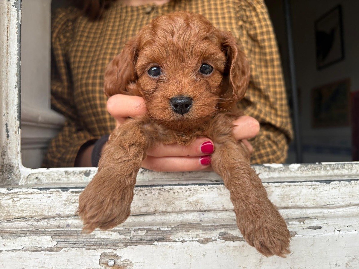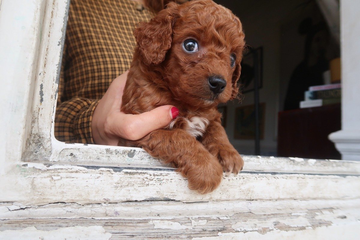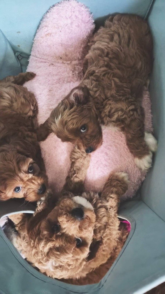 We have six half-Asian toy poodle Cockerpoos. These are specially bred for the “teddy bear look” faces with rounder snouts and big round eyes. They are also smaller than standard toy Cockerpoos and have a calmer nature.They are all absolutely gorgeous and we love them to bits. All have curly hair, great proportions and very sweet teddy bear like faces.