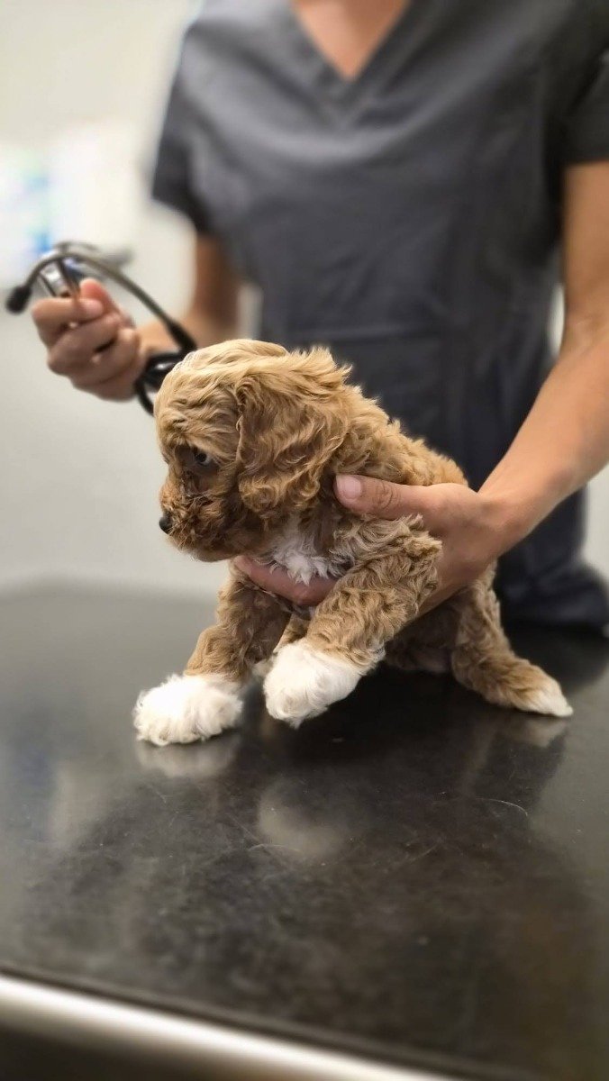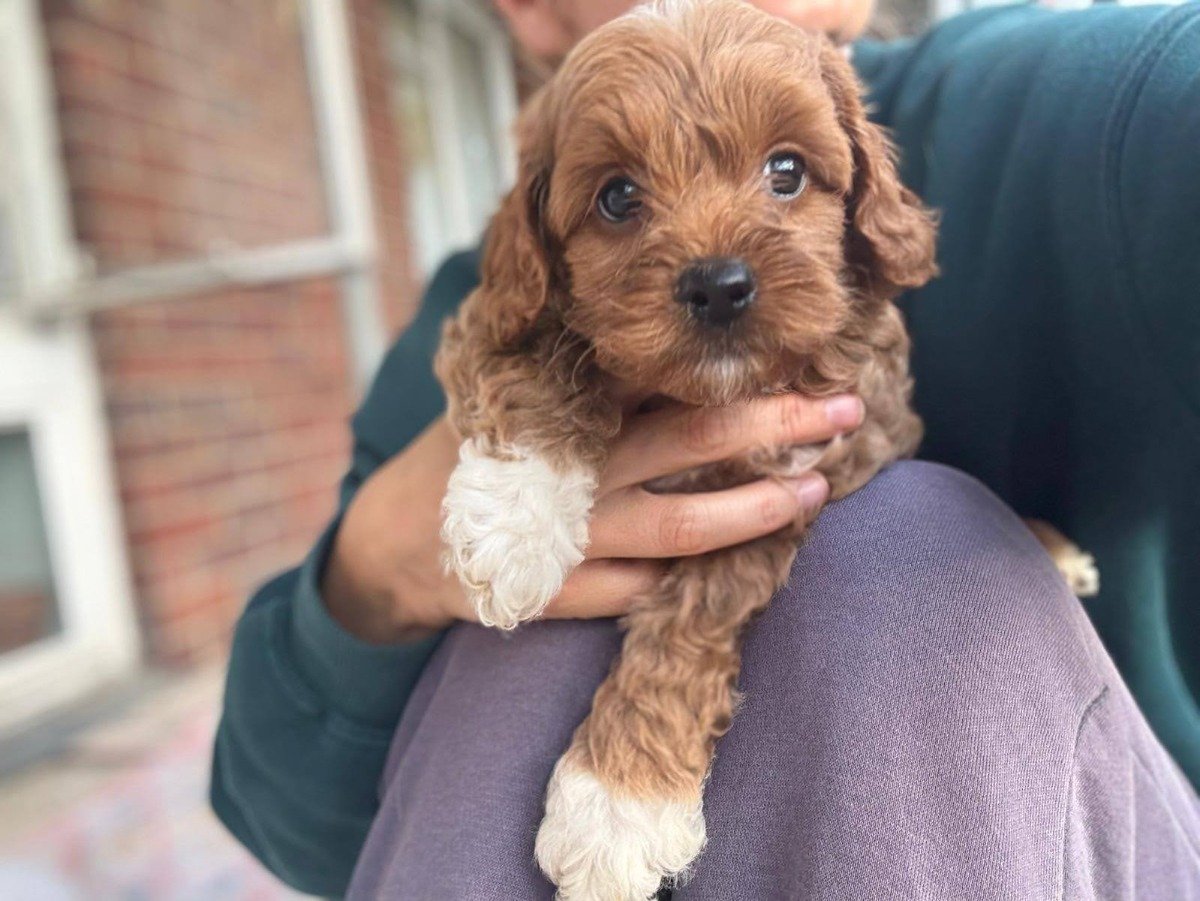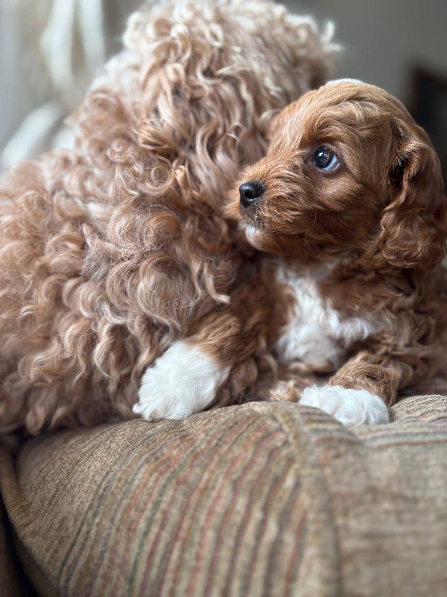 We have six half-Asian toy poodle Cockerpoos. These are specially bred for the “teddy bear look” faces with rounder snouts and big round eyes. They are also smaller than standard toy Cockerpoos and have a calmer nature.They are all absolutely gorgeous and we love them to bits. All have curly hair, great proportions and very sweet teddy bear like faces.